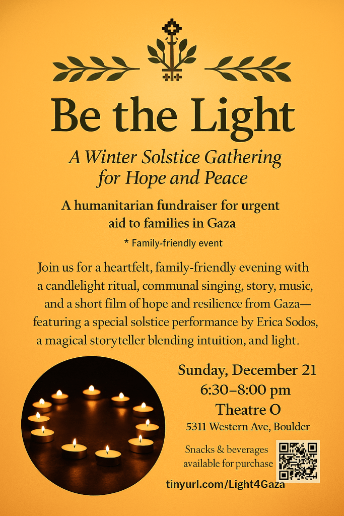 Join us for a heartfelt, family-friendly evening of candlelight ritual, communal singing, story, music, and a short film of hope and resilience from Gaza — featuring a special solstice performance by Erica Sodos, a magical storyteller who blends intuition, wonder, and light.